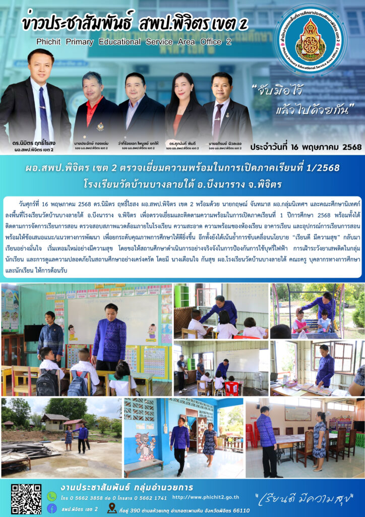 ผอ.สพป.พิจิตร เขต 2 ตรวจเยี่ยมความพร้อมในการเปิดภาคเรียนที่ 1/2568 โรงเรียนวัดบ้านบางลายใต้ อ.บึงนาราง จ.พิจิตร