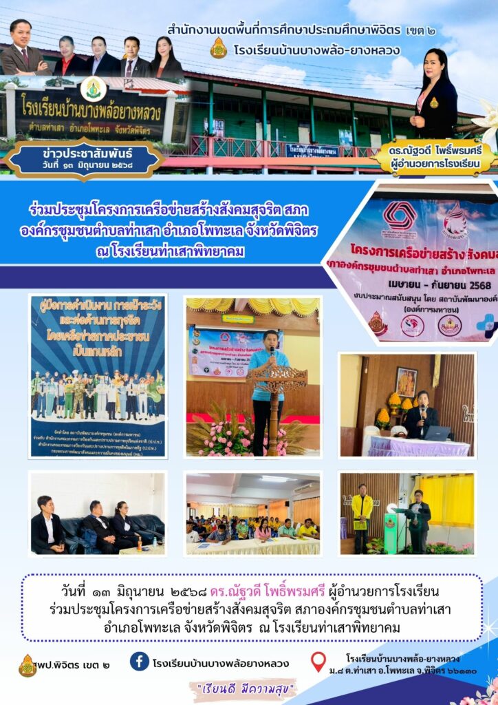 ร่วมประชุมโครงการเครือข่ายสร้างสังคมสุจริต สภาองค์กรชุมชนตำบลท่าเสา อำเภอโพทะเล จังหวัดพิจิตร ณ โรงเรียนท่าเสาพิทยาคม