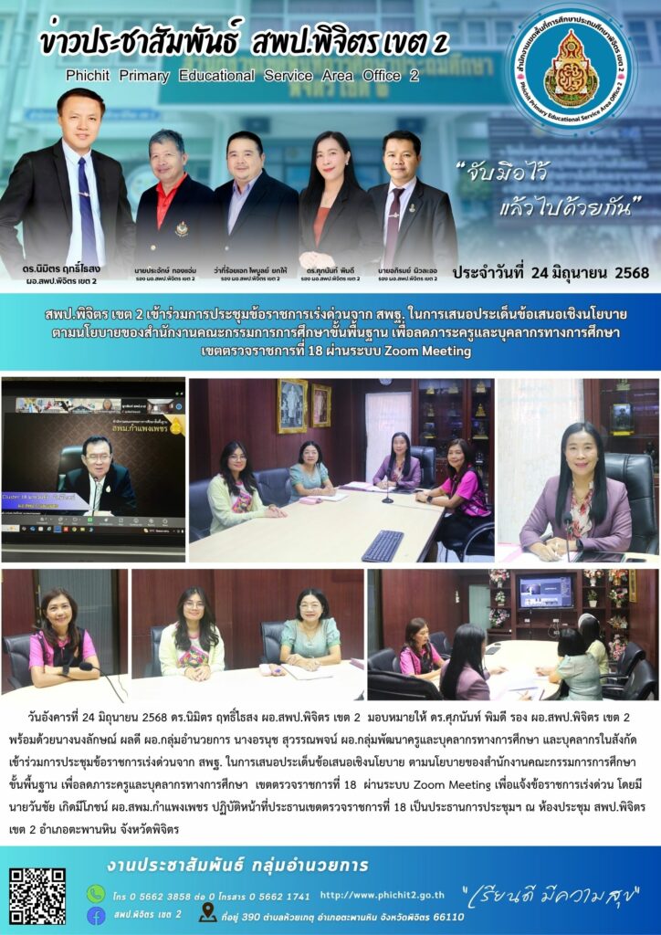 สพป.พิจิตร เขต 2 เข้าร่วมการประชุมข้อราชการเร่งด่วนจาก สพฐ. ในการเสนอประเด็นข้อเสนอเชิงนโยบายตามนโยบายของสำนักงานคณะกรรมการการศึกษาขั้นพื้นฐาน เพื่อลดภาระครูและบุคลากรทางการศึกษาเขตตรวจราชการที่ 18 ผ่านระบบ Zoom Meeting