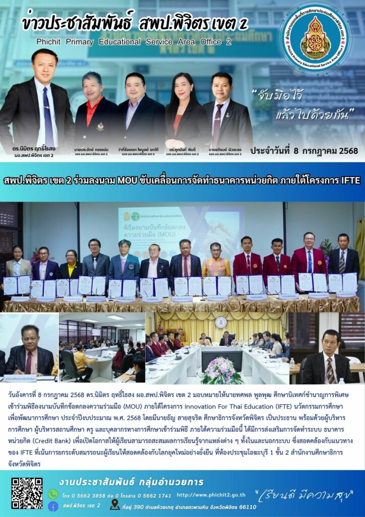สพป.พิจิตร เขต 2 ร่วมลงนาม MOU ขับเคลื่อนการจัดทำธนาคารหน่วยกิต ภายใต้โครงการ IFTE