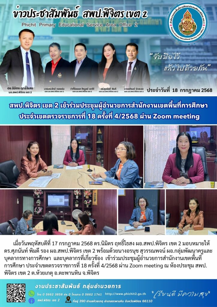 สพป.พิจิตร เขต 2 เข้าร่วมประชุมผู้อำนวยการสำนักงานเขตพื้นที่การศึกษาประจำเขตตรวจราชการที่ 18 ครั้งที่ 4/2568 ผ่าน Zoom meeting