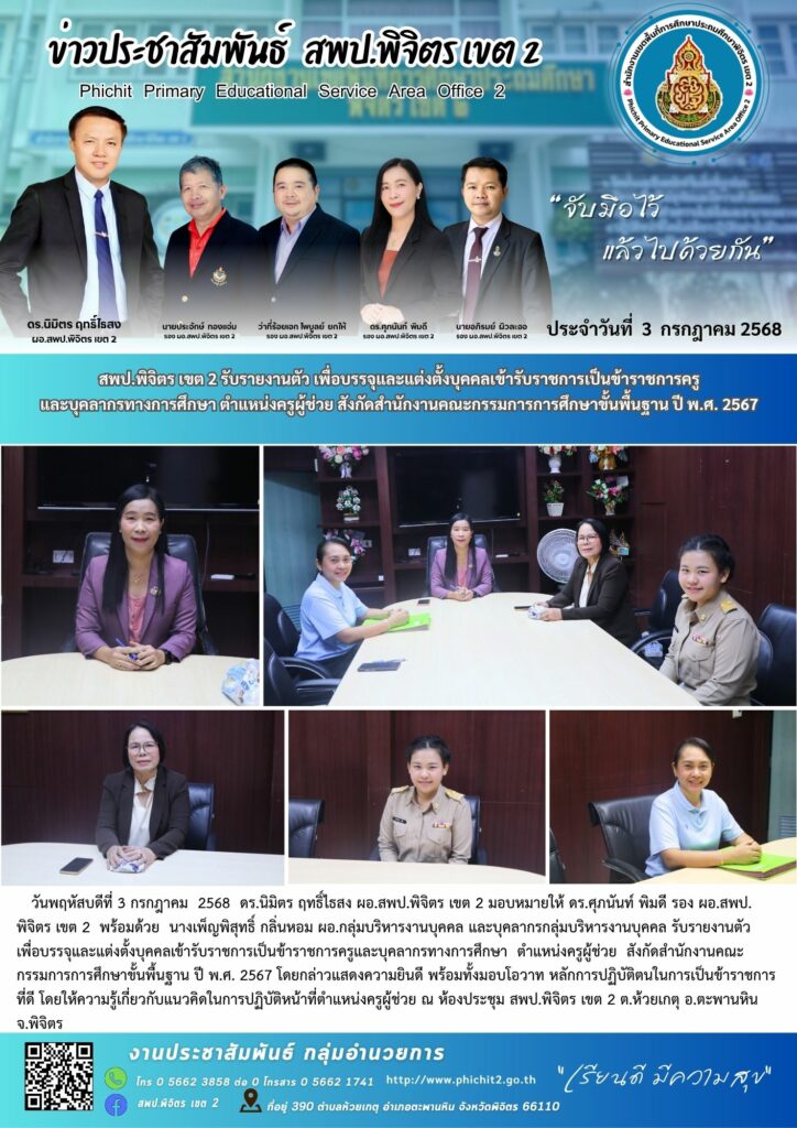 สพป.พิจิตร เขต 2 รับรายงานตัว เพื่อบรรจุและแต่งตั้งบุคคลเข้ารับราชการเป็นข้าราชการครูและบุคลากรทางการศึกษา ตำแหน่งครูผู้ช่วย สังกัดสำนักงานคณะกรรมการการศึกษาขั้นพื้นฐาน ปี พ.ศ. 2567