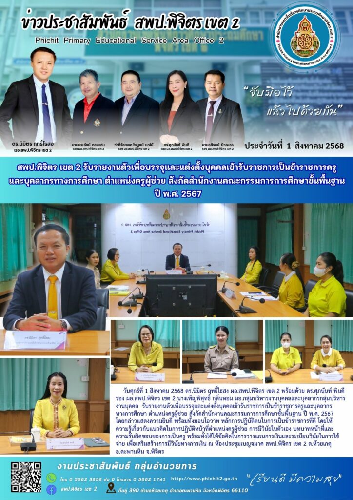 สพป.พิจิตร เขต 2 รับรายงานตัวเพื่อบรรจุและแต่งตั้งบุคคลเข้ารับราชการเป็นข้าราชการครูและบุคลากรทางการศึกษา ตำแหน่งครูผู้ช่วย สังกัดสำนักงานคณะกรรมการการศึกษาขั้นพื้นฐานปี พ.ศ. 2567