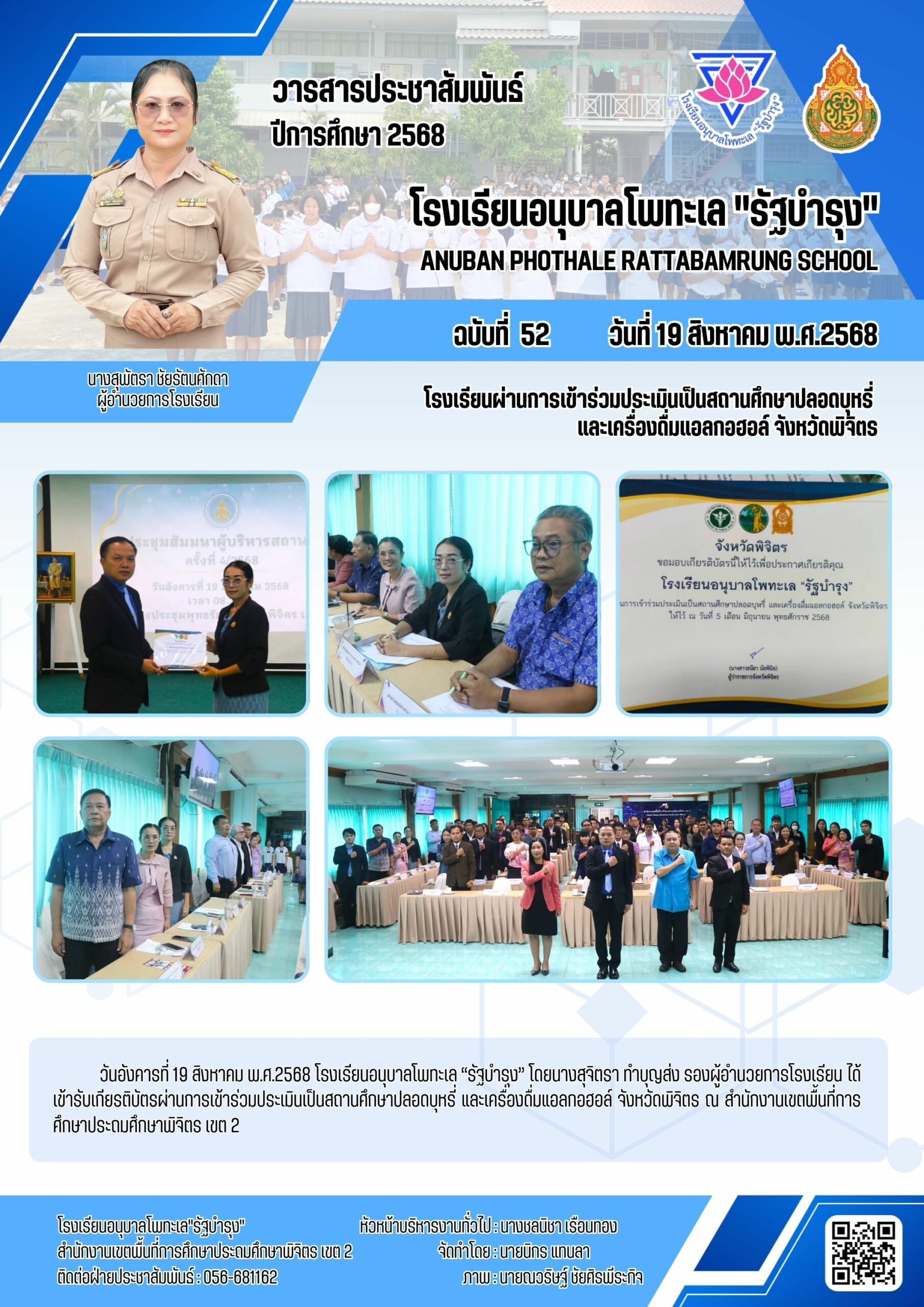 โรงเรียนผ่านการเข้าร่วมประเมินเป็นสถานศึกษาปลอดบุหรี่ และเครื่องดื่มแอลกอฮอล์ จังหวัดพิจิตร