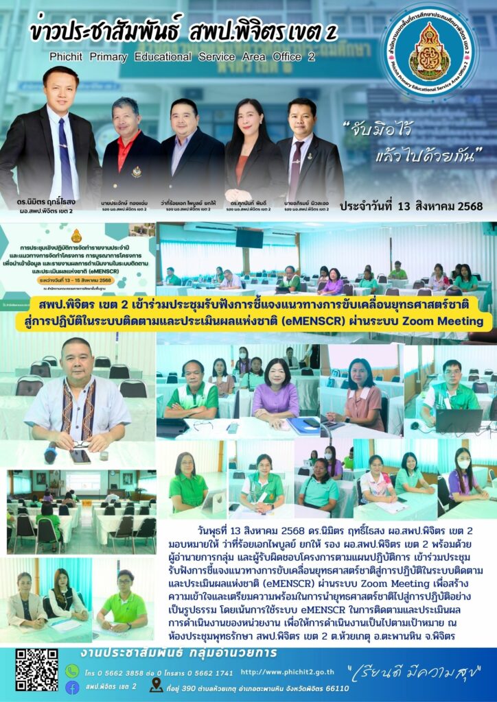 สพป.พิจิตร เขต 2 เข้าร่วมประชุมรับฟังการชี้แจงแนวทางการขับเคลื่อนยุทธศาสตร์ชาติ สู่การปฏิบัติในระบบติดตามและประเมินผลแห่งชาติ (eMENSCR) ผ่านระบบ Zoom Meeting