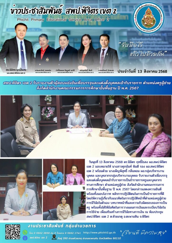 สพป.พิจิตร เขต 2 รับรายงานตัวผู้สอบแข่งขันเพื่อบรรจุและแต่งตั้งบุคคลเข้ารับราชการ ตำแหน่งครูผู้ช่วย สังกัดสำนักงานคณะกรรมการการศึกษาขั้นพื้นฐาน ปี พ.ศ. 2567