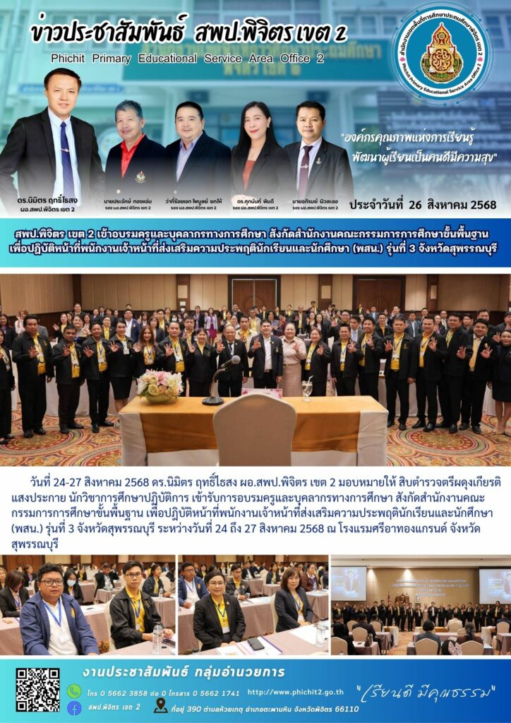 สพป.พิจิตร เขต 2 เข้าอบรมครูและบุคลากรทางการศึกษา สังกัดสำนักงานคณะกรรมการการศึกษาขั้นพื้นฐานเพื่อปฎิบัติหน้าที่พนักงานเจ้าหน้าที่ส่งเสริมความประพฤตินักเรียนและนักศึกษา (พสน.) รุ่นที่ 3 จังหวัดสุพรรณบุรี
