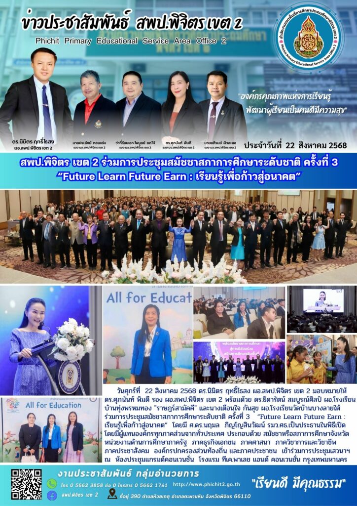 สพป.พิจิตร เขต 2 ร่วมการประชุมสมัชชาสภาการศึกษาระดับชาติ ครั้งที่ 3 “Future Learn Future Earn : เรียนรู้เพื่อก้าวสู่อนาคต”