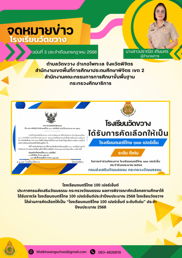 โรงเรียนวัดขวาง ได้ผ่านการคัดเลือกให้เป็น “โรงเรียนดนตรีไทย 100 เปอร์เซ็นต์ ระดับดีเด่น” ประจำปีงบประมาณ 2568