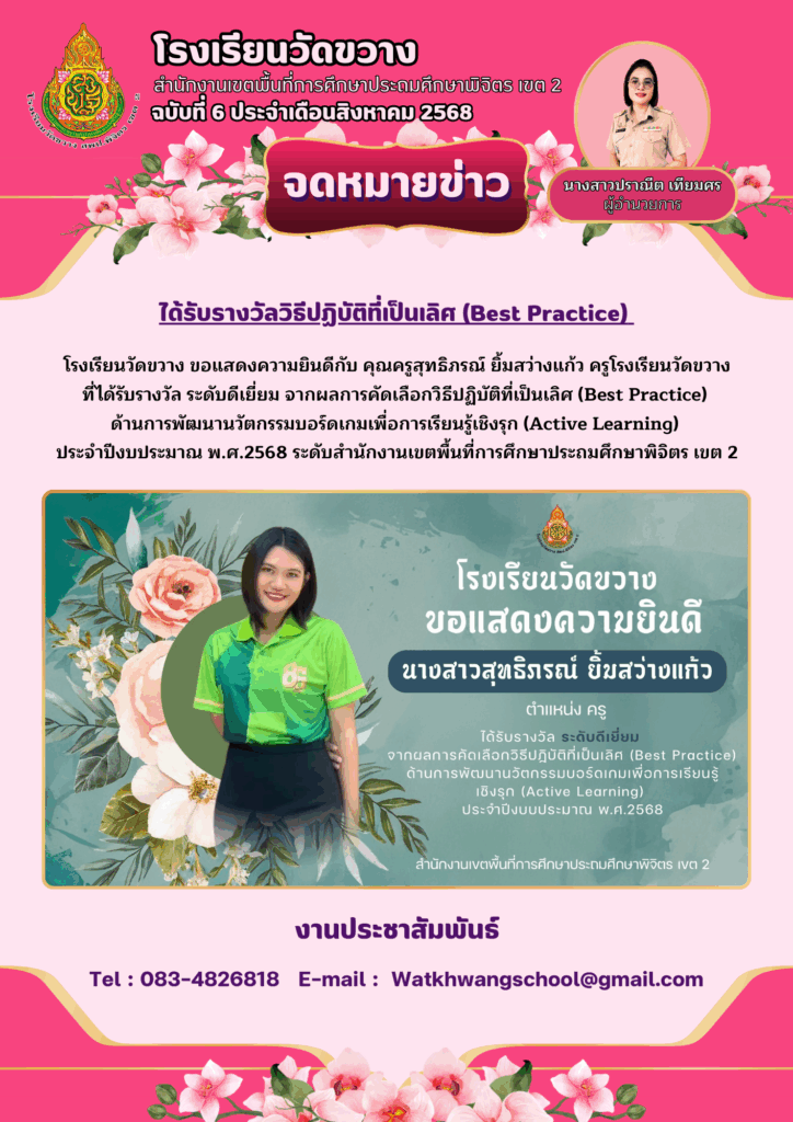 ขอแสดงความยินดีกับ คุณครูสุทธิภรณ์ ยิ้มสว่างแก้ว ที่ได้รับรางวัล ระดับดีเยี่ยม จากผลการคัดเลือกวิธีปฏิบัติที่เป็นเลิศ (Best Practice)