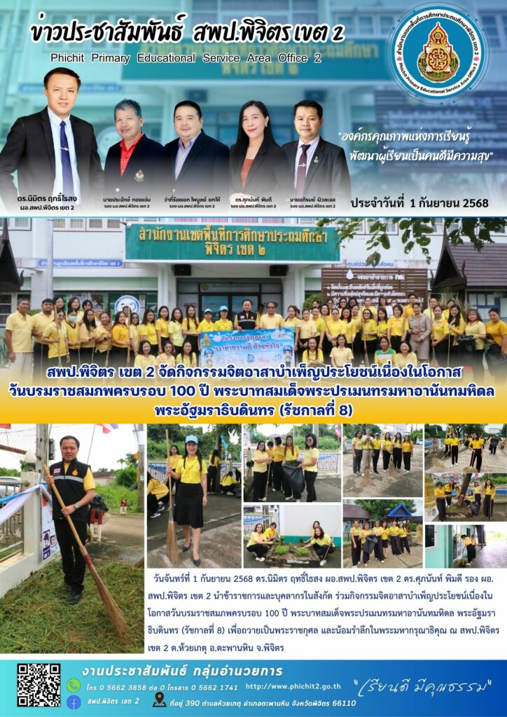 สพป.พิจิตร เขต 2 จัดกิจกรรมจิตอาสาบำเพ็ญประโยชน์เนื่องในโอกาสวันบรมราชสมภพครบรอบ 100 ปี พระบาทสมเด็จพระปรเมนทรมหาอานันทมหิดล พระอัฐมราธิบดินทร (รัชกาลที่ 8)