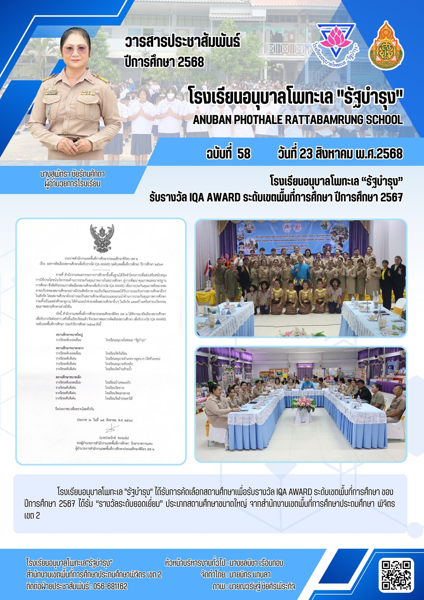 โรงเรียนอนุบาลโพทะเล “รัฐบำรุง” ได้รับรางวัล IQA AWARD ระดับเขตพื้นที่การศึกษา ปีการศึกษา 2567