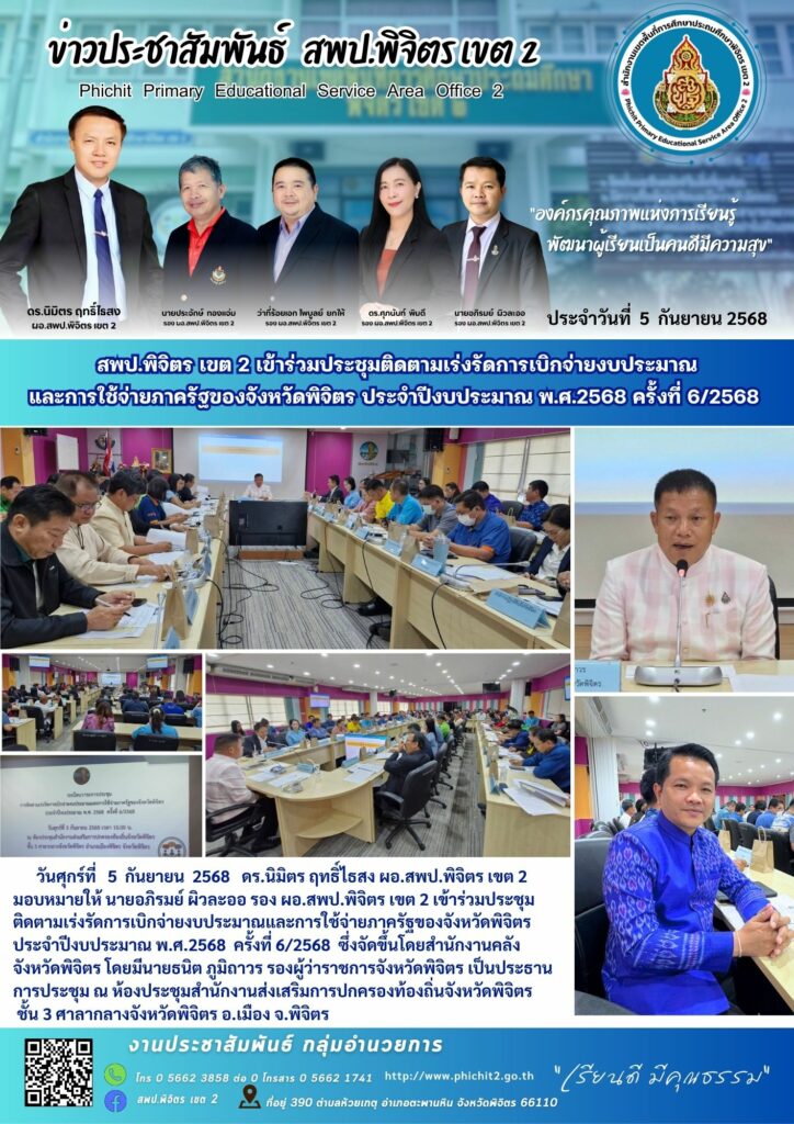 สพป.พิจิตร เขต 2 เข้าร่วมประชุมติดตามเร่งรัดการเบิกจ่ายงบประมาณและการใช้จ่ายภาครัฐของจังหวัดพิจิตร ประจำปีงบประมาณ พ.ศ.2568 ครั้งที่ 6/2568