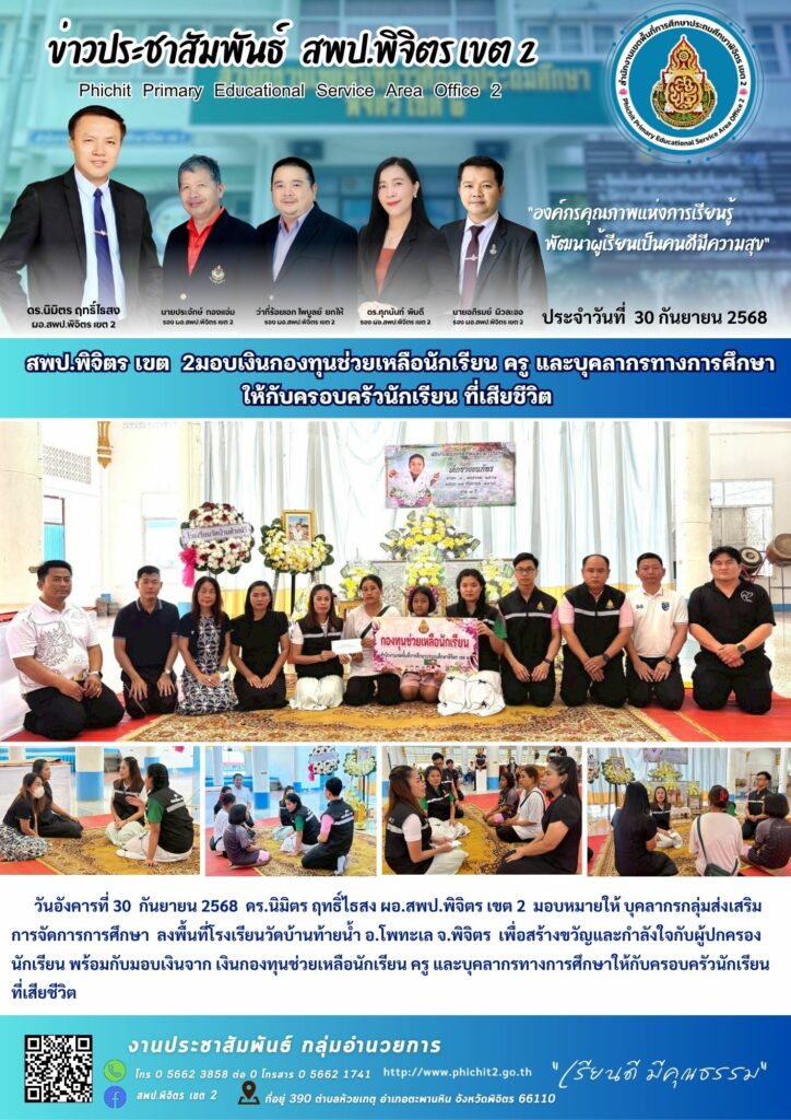สพป.พิจิตร เขต 2มอบเงินกองทุนช่วยเหลือนักเรียน ครู และบุคลากรทางการศึกษา ให้กับครอบครัวนักเรียน ที่เสียชีวิต