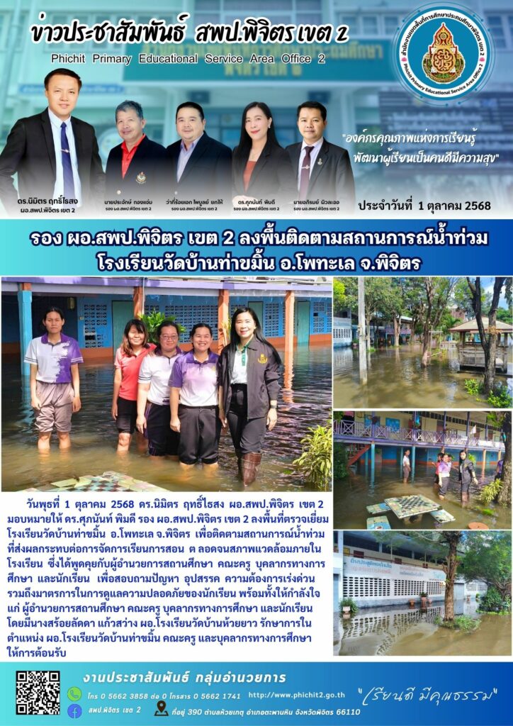 รอง ผอ.สพป.พิจิตร เขต 2 ลงพื้นติดตามสถานการณ์น้ำท่วม โรงเรียนวัดบ้านท่าขมิ้น อ.โพทะเล จ.พิจิตร