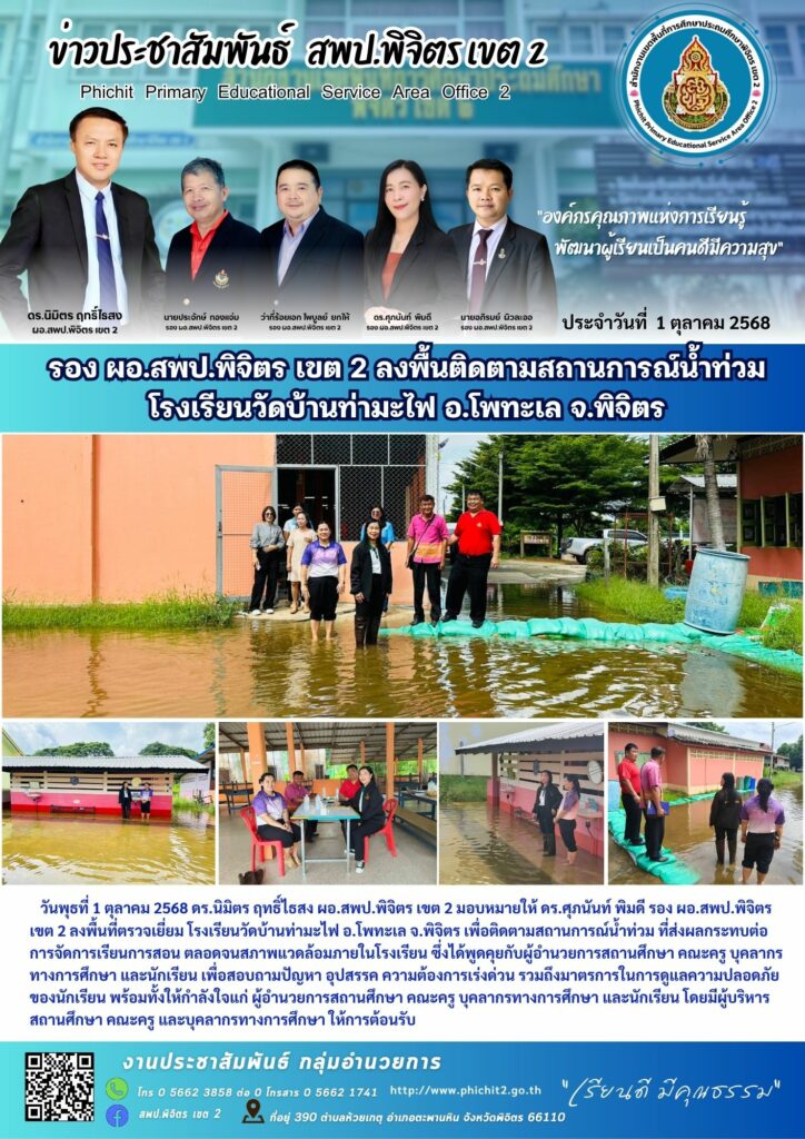 รอง ผอ.สพป.พิจิตร เขต 2 ลงพื้นติดตามสถานการณ์น้ำท่วม โรงเรียนวัดบ้านท่ามะไฟ อ.โพทะเล จ.พิจิตร