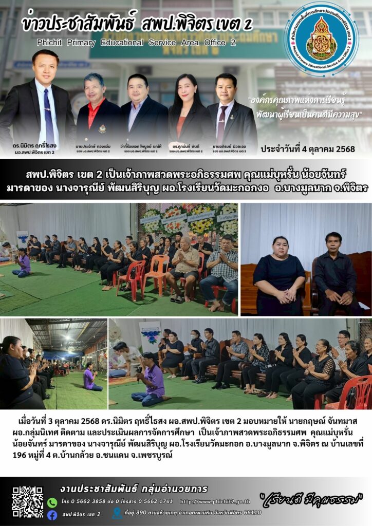 สพป.พิจิตร เขต 2 เป็นเจ้าภาพสวดพระอภิธรรมศพ คุณแม่บุหรั่น น้อยจันทร์ มารดาของ นางจารุณีย์ พัฒนสิริบุญ ผอ.โรงเรียนวัดมะกอกงอ อ.บางมูลนาก จ.พิจิตร