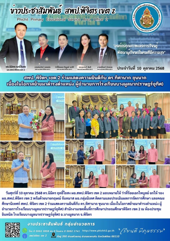 สพป. พิจิตร เขต 2 ร่วมแสดงความยินดีกับ ดร.ทิศานาถ ขุนนาถ เนื่องในโอกาสย้ายมาดำรงตำแหน่ง ผู้อำนวยการโรงเรียนบางมูลนาก(ราษฎร์อุทิศ)