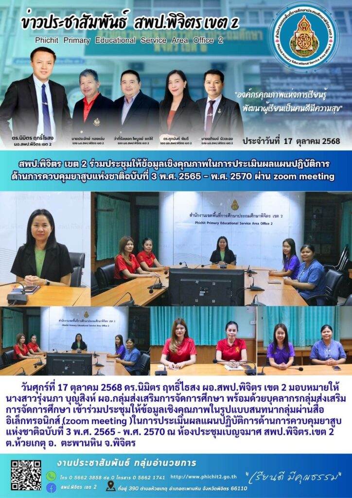 สพป.พิจิตร เขต 2 ร่วมประชุมให้ข้อมูลเชิงคุณภาพในการประเมินผลแผนปฏิบัติการ ด้านการควบคุมยาสูบแห่งชาติฉบับที่ 3 พ.ศ. 2565 – พ.ศ. 2570 ผ่าน zoom meeting