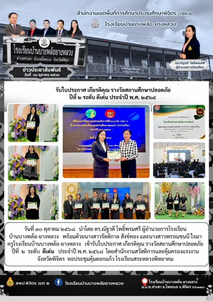 รับใบประกาศ เกียรติคุณ รางวัลสถานศึกษาปลอดภัยปีที่ ๒ ระดับ ดีเด่น ประจำปี พ.ศ. ๒๕๖๘