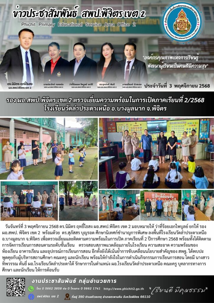 รอง ผอ.สพป.พิจิตร เขต 2 ตรวจเยี่ยมความพร้อมในการเปิดภาคเรียนที่ 2/2568 โรงเรียนวัดลำประดาเหนือ อ.บางมูลนาก จ.พิจิตร