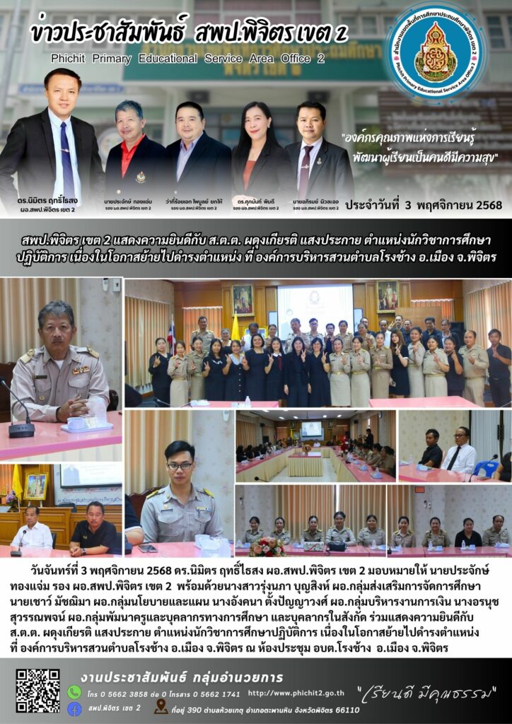สพป.พิจิตร เขต 2 แสดงความยินดีกับ ส.ต.ต. ผดุงเกียรติ แสงประกาย ตำแหน่งนักวิชาการศึกษาปฏิบัติการ เนื่องในโอกาสย้ายไปดำรงตำแหน่ง ที่ องค์การบริหารสวนตำบลโรงช้าง อ.เมือง จ.พิจิตร