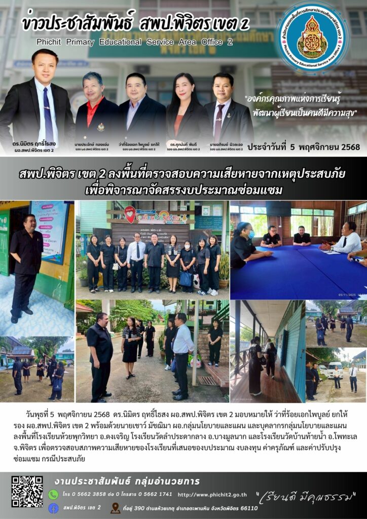 สพป.พิจิตร เขต 2 ลงพื้นที่ตรวจสอบความเสียหายจากเหตุประสบภัยเพื่อพิจารณาจัดสรรงบประมาณซ่อมแซม