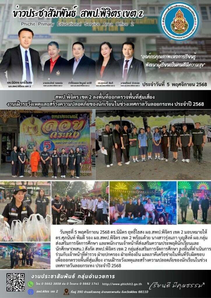 สพป.พิจิตร เขต 2 ลงพื้นที่ออกตรวจพื้นที่สุ่มเสี่ยงงานเฝ้าระวังเหตุและสร้างความปลอดภัยของนักเรียนในช่วงเทศกาลวันลอยกระทง ประจำปี 2568