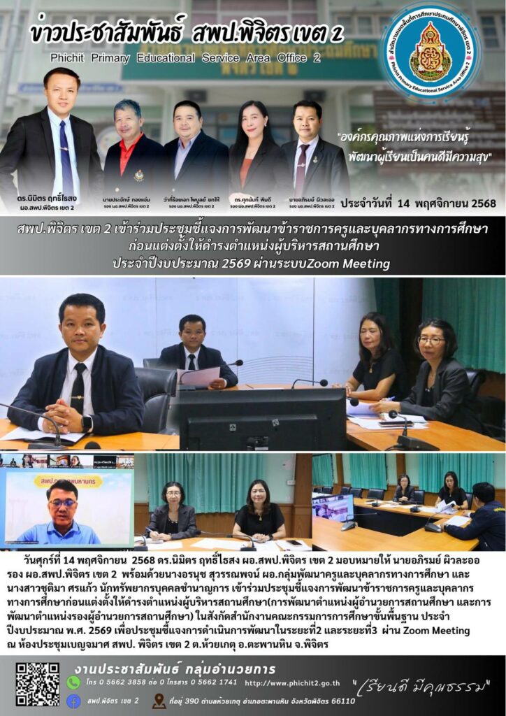 สพป.พิจิตร เขต 2 เข้าร่วมการประชุมชี้แจงการพัฒนาข้าราชการครูและบุคลากรทางการศึกษา ก่อนแต่งตั้งให้ดำรงตำแหน่งผู้บริหารสถานศึกษาประจำปีงบประมาณ 2569 ผ่านระบบZoom Meeting