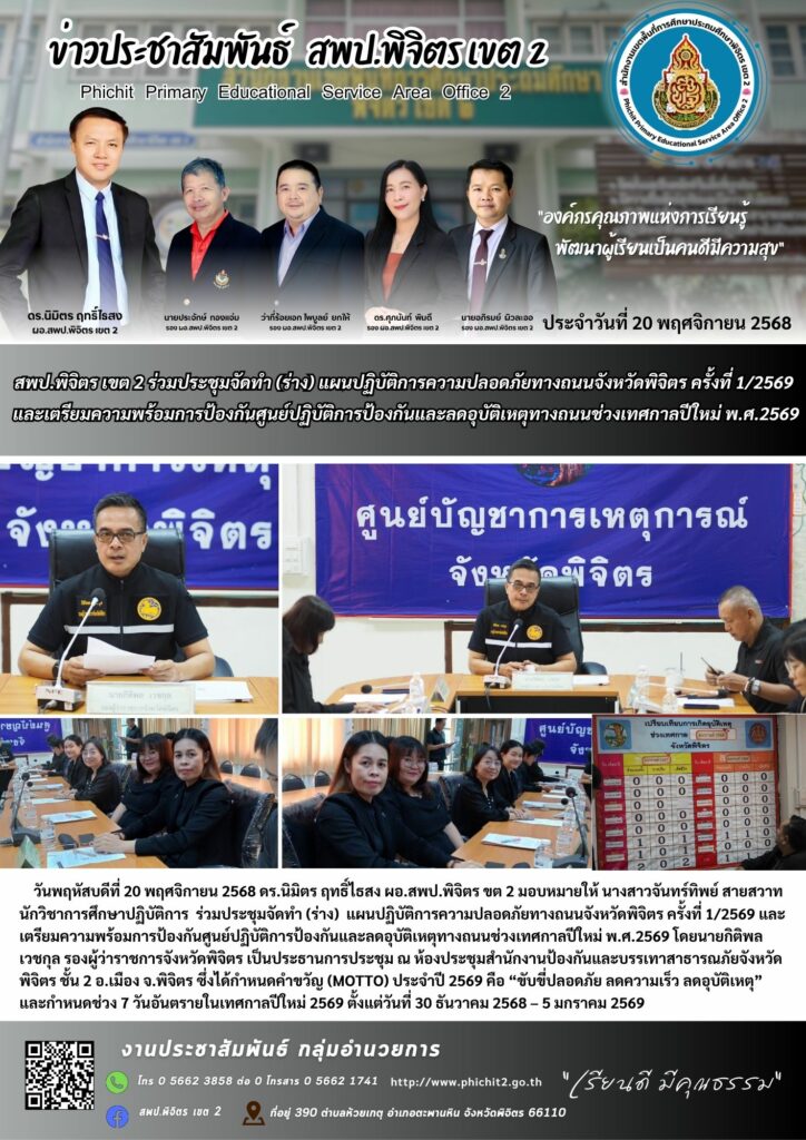สพป.พิจิตร เขต 2 ร่วมประชุมจัดทำ (ร่าง) แผนปฏิบัติการความปลอดภัยทางถนนจังหวัดพิจิตร ครั้งที่ 1/2569 และเตรียมความพร้อมการป้องกันศูนย์ปฏิบัติการป้องกันและลดอุบัติเหตุทางถนนช่วงเทศกาลปีใหม่ พ.ศ.2569