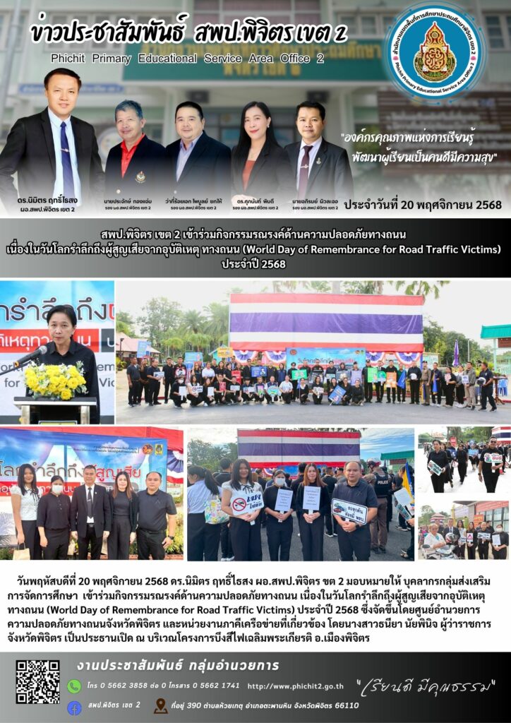 สพป.พิจิตร เขต 2 เข้าร่วมกิจกรรมรณรงค์ด้านความปลอดภัยทางถนนเนื่องในวันโลกรำลึกถึงผู้สูญเสียจากอุบัติเหตุ ทางถนน (World Day of Remembrance for Road Traffic Victims) ประจำปี 2568