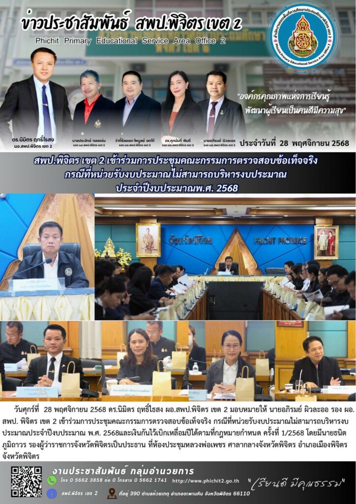 สพป.พิจิตร เขต 2 เข้าร่วมการประชุมคณะกรรมการตรวจสอบข้อเท็จจริง กรณีที่หน่วยรับงบประมาณไม่สามารถบริหารงบประมาณ ประจำปีงบประมาณพ.ศ. 2568