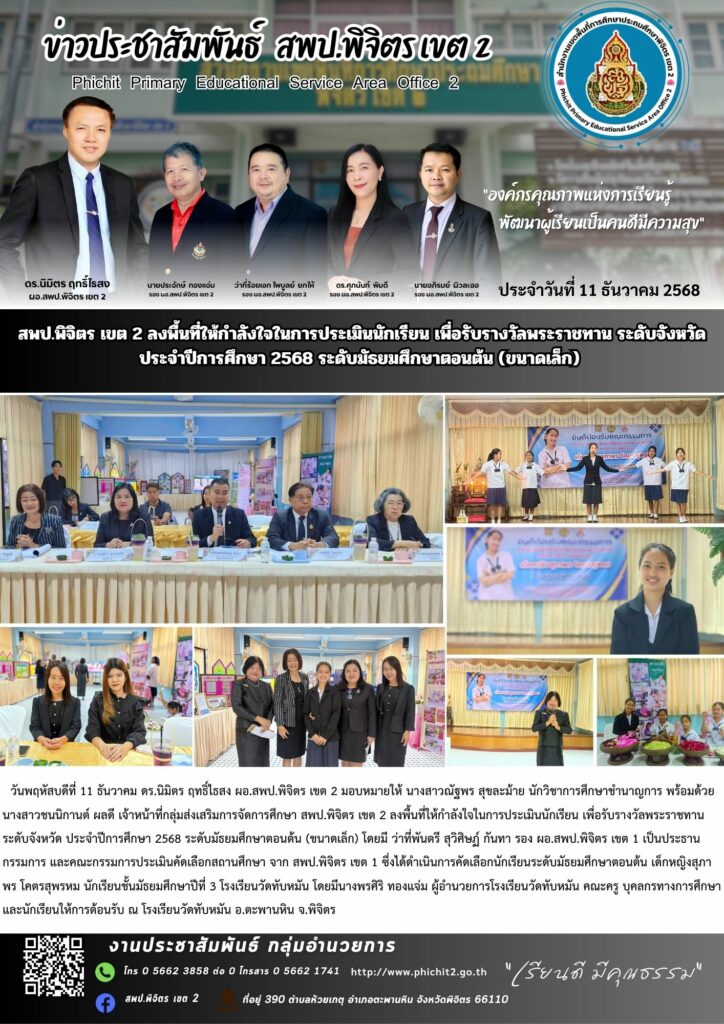 สพป.พิจิตร เขต 2 ลงพื้นที่ให้กำลังใจในการประเมินนักเรียน เพื่อรับรางวัลพระราชทาน ระดับจังหวัด ประจำปีการศึกษา 2568 ระดับมัธยมศึกษาตอนต้น (ขนาดเล็ก)