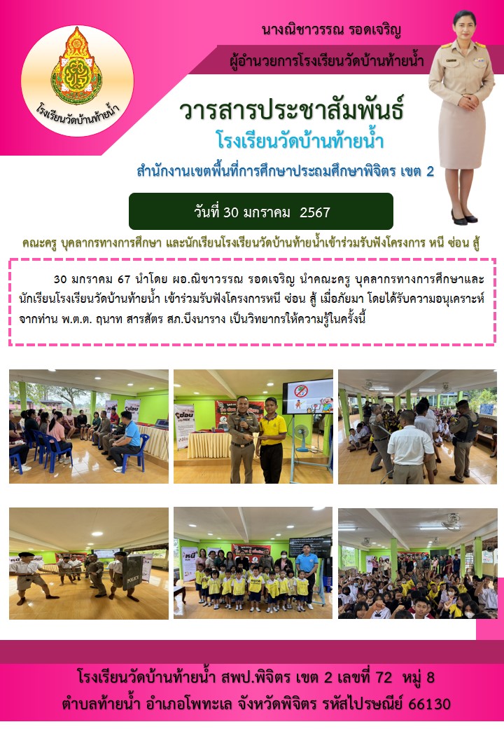 คณะครู บุคลากรทางการศึกษา และนักเรียนโรงเรียนวัดบ้านท้ายน้ำเข้าร่วมรับฟังโครงการ หนี ซ่อน สู้โรงเรียนวัดบ้านท้ายน้ำ30 มกราคม 256731 มกราคม 2024